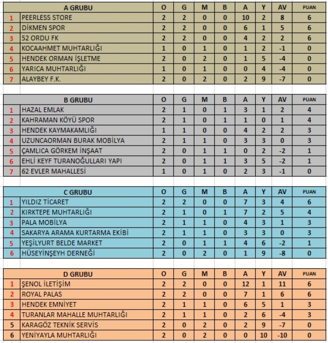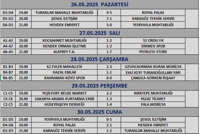 26-30 Mayıs 2025 Tarihinde oynanan Geleneksel Hendek Kaymakamlığı Futbol Turnuvası müsabakalarının sonuçları ve oluşan puan tablosu