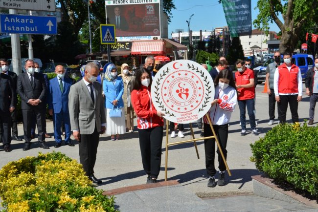 19 MAYIS TÖRENLE KUTLANDI19 Mayıs Atatürk'ü Anma ve Gençlik ve Spor Bayramı, Cumhuriyet Meydanı'nda düzenlenen çelenk sunma töreni ile kutlandı.KOVİD-19 tedbirleri kapsamında düzenlenen törene Hendek Belediye Başkanı Turgut Babaoğlu, Hendek İlçe Emniyet Müdürü Şevket İlhan, İlçe Jandarma Karakol Komutanı Teğmen Sertaç Kaya, Gençlik ve Spor İlçe Müdürü Süleyman Akıcı, siyasi partilerin temsilcileri, Okul Müdürleri, Gaziler, öğretmenler ve öğrenciler katıldı.TÖRENTören, Gençlik ve Spor İlçe Müdürlüğü tarafından meydanda Atatürk anıtına çelenk sunulmasıyla başladı. Saygı duruşu ve İstiklal Marşı okunmasının ardından Hendek Anadolu Lisesi öğrencileri günün anlam ve önemi belirten ‘Şu Sonsuz Koşu’ ve ‘Bir Gemi Yanaştı Samsuna’ şiirlerini okudular. Cumhuriyet Meydanında gerçekleşen törenin ardından protokol mensupları günün anısına öğrencilerle birlikte fotoğraf çektirdi ve tören programı sona erdi.