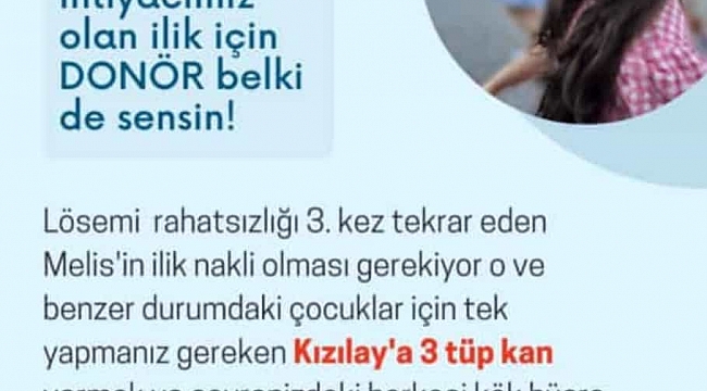 Lösemi rahatsızlığı 3. kez tekrar eden Melis'in ilik nakli olması gerekiyor. Melis ve benzer durumdaki çocuklar için yapmanız gereken tek şey; Kızılay'a 3 tüp kan vermek ve çevrenizdeki herkesi, kök hücre bağışı konusunda bilgilendirmek!