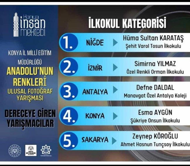 Akyazılı Öğrenci Konya’da Ödül KazandıKonya İl Milli Eğitim Müdürlüğü’nün ulusal çapta düzenlemiş olduğu "Anadolu'nun Renkleri" isimli fotoğraf yarışmasında Akyazı Ahmet Hasnun Tunçsoy İlkokulu öğrencisi Zeynep Köroğlu 5. olarak ödül kazandı.Akyazı Ahmet Hasnun Tunçsoy İlkokulu Müdürü Fatih Oğuzhan, 3. Sınıf öğrencisi Zeynep Köroğlu, öğrenci velisi Kamil Köroğlu ve sınıf öğretmeni Öznur Özel Durmuş Akyazı İlçe Milli Eğitim Müdürü Recep Özdemir’i ziyaret ettiler.İlçe Milli Eğitim Müdürü Recep Özdemir makamında ağırladığı öğrenciye başarılarının devamını dileyerek hediye takdiminde bulundu.