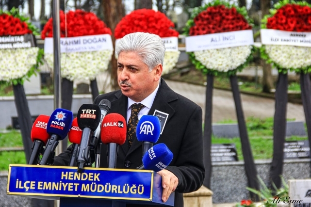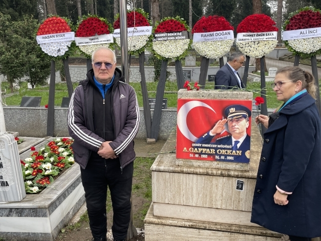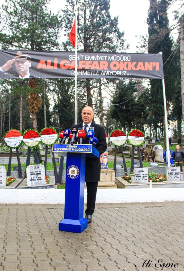 Hendek Kaymakamı Hacı Hasan Gökpınar ise yaptığı konuşmada, “Hendek’in evladı Ali Gaffar Okan’ı ve beş mesai arkadaşını şehadete uğurlayışımızın 25. anma programına katılımlarınızdan dolayı hepinize hoş geldiniz. Burada bulunan pek çok kişinin şehit emniyet müdürümüz ile bir anısı, bir hikayesi, bir geçmişi var. Başta ailesi olmak üzere çocukluk arkadaşları, mahalle arkadaşları, gençlik arkadaşları, devre arkadaşları ve silah arkadaşları olmak üzere burada bulunan pek çok kişinin Gaffar Okkan müdürümüzle bir geçmiş var. Ancak burada şunu ifade etmek isterim ki benim de Hendek Kaymakamlığım haricinde kendisiyle bir gönül, bir vefa bağım var. Benim babam da bir teşkilat mensubu ve hatta benim babam kendisinin yetiştirirdi ve kendi ekibinde çalıştığı bir teşkilat mensubu. İzmir Polis okulunda iken 1982 yılında kendisi Baş komiser rütbesindeyken babanların grubunun dersine girmiş ve akabinde babamın tayini İzmir Emniyet Müdürlüğü’ne çıkmasıyla birlikte kendisi babamı ekibine dahil etmiş ve 2 yıl onun maliyetinde babam görev yapmış. Tabiri caizse de polisliği kendisinden öğrenmiş. Benim Gaffar Müdürümle yolumun ikinci kez kesişmesiyse 2017 yılında Diyarbakır’a Vali Yardımcısı olarak tayinimin çıkmasıyla oldu. Hakikaten ona olan sevgiyi bizzat Diyarbakırlılardan dinledim. Kendisi sporun Diyarbakır üzerindeki etkisini çok iyi analiz etmiş ki Diyarbakırspor’un tüm iç sağ maçlarına ve hatta yakınlardaki tüm deplasman maçlarına bizzat katılmış, adeta gönüllü Diyarbakırspor Başkanı gibi olmuş. Tabi sadece sportif faaliyetlerle değil polisiye tedbirlerle de daha güzel bir Diyarbakır, daha huzurlu bir Diyarbakır için ve mesai harcamış. Bu duygu ve düşüncelerle Türk Polis Teşkilatının yetiştirdiği önemli değerlerden biri olan Şehit Ali Gaffar Okkan Müdürümüze Allah’tan rahmet acılı ailesine sabır ve metanet diliyorum” dedi.AK PARTİ SAKARYA MİLLETVEKİLİ ALİ İNCİ UMRE’DEN MESAJLA ANDIUmre görevi nedeniyle kutsal topraklarda bulunan AK Parti Sakarya Milletvekili Ali İnci, Hendekli Şehit Emniyet Müdürü Ali Gaffar Okkan’ı unutmadı. Umreden göndermiş olduğu mesajında, “ Bugün burada bulunmayı gönülden arzu etmeme rağmen, umre ziyaretimden dönüş sürecimin uzaması nedeniyle anma programınıza fiilen katılamıyorum. Ancak bilinmesini isterim ki; bu mübarek topraklarda bulunduğum süre boyunca Şehidimiz Ali Gaffar Okkan başta olmak üzere tüm şehitlerimiz için dualar ettim. Bu vesileyle; Aziz şehidimizin kıymetli ailesine, yakınlarına, silah arkadaşlarına ve dostlarına bir kez daha başsağlığı ve sabırlar diliyorum. Anma programına teşrif eden tüm misafirlerimize ve vefalı Hendekli hemşehrilerime hoş geldiniz diyorum. Ali Gaffar Okkan, bu milletin vicdanında ve hafızasında daima yaşayacak; adaletin, cesaretin ve kardeşliğin sembolü olarak unutulmayacaktır. Yüce Allah’tan aziz şehidimize rahmet, tüm şehitlerimize makam-ı ali niyaz ediyorum. Ruhu şad, mekanı cennet olsun” ifadelerine yer verdi.SAKARYA VALİSİ DOĞAN: ŞEHİTLERİMİZLE NE KADAR ÖVÜNSEK AZDIRSon olarak konuşan Sakarya Valisi Rahmi Doğan ise yaptığı konuşmada, “ Şehit Ali Gaffar Okkan'ın şehadetinin yıl dönümünde yine mezarının başında birlikteyiz. Öncelikle şehidimiz Ali Gaffar Okkan ve şehit silah arkadaşlarını buradan rahmet, minnet ve şükranla yad etmek istiyorum. Allah onları rahmet eylesin. Mekanları cennet olsun. Makamları ali olsun. Bu toprakları bizlere Vatan yapan tüm şehitlerimizi rahmetle anıyoruz. Gazilerimize sağlık, sıhhat ve huzur diliyoruz. Ahirete irtihal eden Gazilerimize de Allah'tan rahmet diliyoruz. Bu topraklar bugün hür ve özgür bir şekilde yaşıyorsa şehitlerimizin sayesindedir. Onları minnet ve şükranla yad ediyoruz. Coğrafyamıza baktığımızda bugün Türkiye'nin bulunmuş olduğu bu konumu irdelediğimizde şehitlerimizin kanlarının yerde kalmadığını, şehitlerimizin bu toprakları böldürtmediğini, Türkiye'nin güçlü ve kuvvetli bir şekilde yolla devam ettiğini görüyoruz. Bu vatanı bölmek isteyenler vardı ama bu vatan büyüyerek yoluna devam ediyor, bu toprakları parçalamak isteyenler vardı ama gördüğünüz gibi birlik ve beraberlik içerisinde yolumuza devam ediyoruz. Güçlü Türkiye hem Türk milleti için hem de dost ve gönüldaş olan Milletler için güven, güç ve kuvvet vermektedir. Bundan dolayı da millet olarak ne kadar övünsek yeridir. Yıllardır şehitler veriyoruz, bugün terörsüz Türkiye anlamında yapılan bu çalışmalarda şehitlerimizin ne kadar büyük emeği olduğu ortada. Bundan dolayı da hemen mezarı başında bulunduğumuz Ali Gaffar Okkan ve birlikte şehit olduğu silah arkadaşlarına şükranlarımızı sunuyoruz. Ali Gaffar Okkan gerçekten hem teşkilatımıza örnek bir Emniyet Müdürü hem de Türk milletine, gençlerine örnek bir şahsiyetti. Allah rahmet eylesin” diye konuştu.ŞEHİDİN ANISINA TOTEM AÇILIŞI GERÇEKLEŞTİRİLDİHendek Belediye mezarlığında düzenlenen törenin ardından il ve ilçe protokolü ile vatandaşların yoğun katılımlarıyla dualar eşliğinde şehidin babasına ait fırınının önünde şehidin anısına dikilen totemin açılışı gerçekleştirildi. Anma programları Gaffar Okkan’ın adının verildiği Tepecik Ali Gaffar Okkan Camiinde öğlen namazı öncesi Mevlid-i şerif okutularak son buldu.