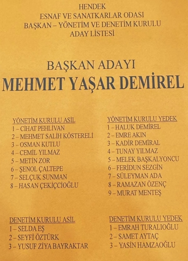 Faaliyet raporlarının okunarak oylanmasının ardından dilek ve temennilere geçildi. Hendek Belediye Başkanı İrfan Püsküllü ve mevcut Başkan Mehmet Yaşar Demirel kısa bir konuşma yaptı.BAŞKAN DEMİREL'İN YÖNETİM KURULU LİSTESİHendek Esnaf ve Sanatkarlar Odası seçimine tek listeyle aday olarak giren Mehmet Yaşar Demirel, yeniden dört yıllık göreve seçildi. Başkan Demirel'in listesi şu isimlerden oluştu;Cihat PehlivanMehmet Salih KöstereliOsman KutluCemil YılmazMetin ZorŞenol ÇaltepeSelçuk SunmanHasan ÇekiççioğluDENETİM KURULUSelda EşSeyfi ÖztürkYusuf Ziya Bayraktar