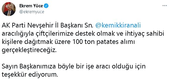 Başkan Ekrem Yüce’den çiftçiye ve ihtiyaç sahiplerine destekTarım ve Orman Bakanlığının stok artışlarını önlemek için patates ve kuru soğan alımına başlayacaklarını açıklamasının ardından başlatılan kampanyaya Başkan Ekrem Yüce’den destek geldi. Yüce sosyal medya hesabından 100 ton patates alımı gerçekleştireceklerini ve patateslerin ihtiyaç sahiplerine ücretsiz dağıtılacağını açıkladı.Cumhurbaşkanı Sayın Recep Tayyip Erdoğan’ın talimatlarıyla Tarım ve Orman Bakanı Bekir Pakdemirli’nin stok artışlarını önlemek için patates ve kuru soğan alımına başlayacaklarını açıklamasının ardından AK Parti Nevşehir İl Başkanı Ali Kemikkıran tarafından başlatılan patates alımı kampanyasına Başkan Ekrem Yüce’den destek geldi. Sosyal medya hesabından yaptığı açıklamayla Başkan Ekrem Yüce, çiftçilere ve ihtiyaç sahiplerine destek olmak adına 100 ton patates alımı gerçekleştireceklerini ve patateslerin ihtiyaç sahiplerine ücretsiz dağıtılacağını açıkladı. Başkan Ekrem Yüce kampanyaya desteğini sosyal medyadan yaptığı, “AK Parti Nevşehir İl Başkanı Sayın Ali Kemikkıran aracılığıyla çiftçilerimize destek olmak ve ihtiyaç sahibi kişilere dağıtmak üzere 100 ton patates alımı gerçekleştireceğiz. Sayın Başkanımıza böyle bir işe aracı olduğu için teşekkür ediyorum” açıklama ile duyurdu.