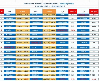 Ak Parti Hendek İlçe Teşkilatı 16 Nisan Referandum Sonuçları ile ilgili yaptığı Seçim Analizlerini Basın aracılığıyla kamuoyunla paylaştı.Ak Parti İlçe Teşkilatı tarafından yayınlanan Seçim Analizlerine göre Hendek Ak Parti İlçe Teşkilatı Sakarya'nın 1. oldu.Ak Parti Hendek İlçe Teşkilatı Seçim Analizlerini 1 Kasım Genel Seçimlerinde Hendek'te aldığı oy oranına göre yaptı... 1 Kasım 2015 Genel Seçimlerinde AK PARTİ Hendek Seçmeninden 32.918 oy alarak oy yüzdesi olarak %68.60 oranını yakaladı. 1 Kasım 2015 Genel Seçimlerinde MHP Hendek Seçmeninden 6488 oy alarak oy yüzdesi olarak %13,52 oranını yakaladı. 1 Kasım 2015 Genel Seçimlerine göre AKP+MHP=Hendek seçmeninden 39.406 oy aldı.(32.918+6488=39406)... 1 Kasım 2015 Genel Seçimlerinde AKP+MHP=%68.60+%13.52=%82,12 Oy oranını yakaladı... 16 Nisan Referandum Seçimlerinde AK PARTİ ile MHP birlikte çalışmalar yaptı.Bu Çalışmalara bazı partiler ve STK larda destek verdi.16 Nisan Referandum Seçimi Evet ve Hayır Oyları olarak sandıklara girdi.Parti amblemleri yarışmadı.Hendek'te Evet Oyları olarak %70,60 oy oranı ile 35110 oy çıktı. 1 Kasım Seçimleri ile kıyaslanırsa AK PARTİ Hendek'te oylarını %2 arttırmadı. Aksine oyları %12 düştü... 1 Kasım Seçimleri kıyaslanırsa AK PARTİ Hendek'te oylarını 2192 oy arttırmadı.Ak Partinin oyları 4210 oy düştü. Hendek Ak Parti İlçe Başkanı Ali Kemal Sofu bu Analizleri yaparken 1 Kasım'da MHP'nin Hendek'te aldığı %13.52 oy oranını ve 6488 MHP Oyunu hesaba katmalıdır.MHP Oylarını yok sayarak MHP Oylarını AK PARTİ Oyu olarak sayarak kendini başarılı göstermek siyasi açıdan hiçte etik değildir.Bunun adına ister Oy Hırsızlığı deyin isterseniz Emek hırsızlığı deyin.Bunun adına bana göre MHP'nin oylarıyla yapılan siyasi efelik denir...