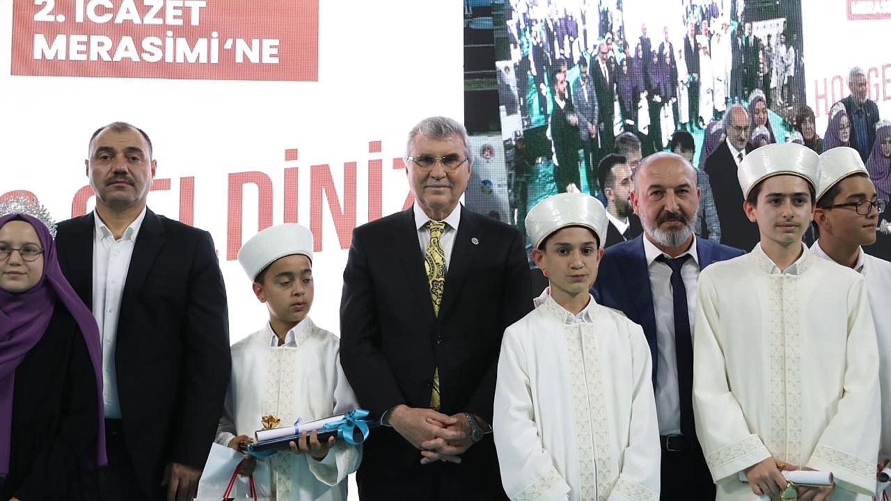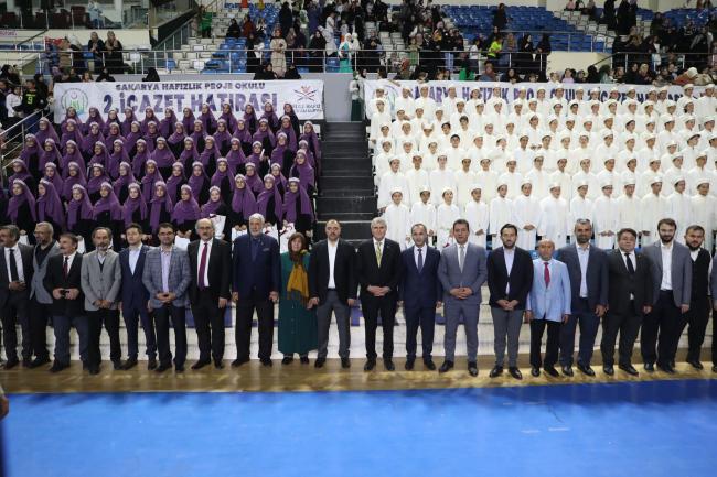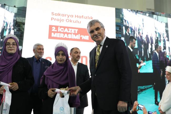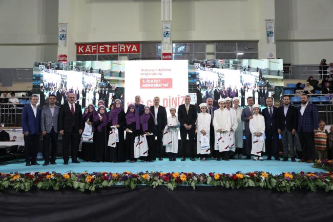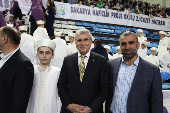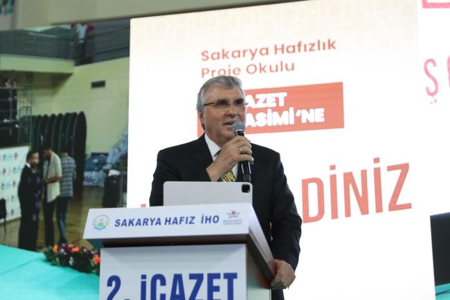 Şehit Bülent Yurtseven İmam Hatip Ortaokulunda hafızlık eğitimini tamamlayan 186 öğrenci için düzenlenen 2. Hafızlık İcazet Merasimine katılan Başkan Ekrem Yüce, “Değişen dünyaya ve bakış açılarına rağmen manevi değerlerinden kopmadan kendisini yetiştiren, yaşadığı çağı anlayan ve bu çağ yönlendirmek için mücadele veren genç kardeşlerimi yürekten tebrik ediyorum” dedi.Sakarya Büyükşehir Belediye Başkanı Ekrem Yüce, Şehit Bülent Yurtseven İmam Hatip Ortaokulunda hafızlık eğitimini tamamlayan öğrenciler için düzenlenen 2. Hafızlık İcazet Merasimine katıldı. Merasime Başkan Yüce’nin yanı sıra Vali Çetin Oktay Kaldırım, AK Parti Milletvekili Çiğdem Erdoğan Atabek, AK Parti İl Başkanı Yunus Tever, İl Milli Eğitim Müdürü Ebubekir Sıddık Savaşçı, İl Müftüsü Hasan Başiş, MEB Talim ve Terbiye Kurulu Başkan Yardımcısı Ahmet İşleyen, MEB Din Öğretimi Genel Müdürü Mehmet Nezir Gül, sivil toplum kuruluşları temsilcileri, basın mensupları ve öğrencilerin velileri katıldı. Serdivan Spor Salonunda düzenlenen merasimde 186 öğrenci hafızlık icazetlerini aldı. Merasim toplu fotoğraf çekimiyle sona erdi.Sevinçleri yüzlerinden okunuyorHafızlık İcazet Merasiminde öğrencilere ve velilere seslenen Başkan Ekrem Yüce, “Bugün icazetlerini alarak hepimizin özendiği o makama hafızlık tahtına kavuşan kardeşlerimi tebrik ederim. Allah mübarek etsin. Hafız anne-babası olacak kardeşlerimin gururu, mutluluğu, sevinci yüzlerinden okunuyor. İnşallah bu dünyada evlatları için yapabilecekleri en değerli şeylerden birini yapmış oldular. Değişen dünyaya ve bakış açılarına rağmen manevi değerlerinden kopmadan kendisini yetiştiren, yaşadığı çağı anlayan ve bu çağ yönlendirmek için mücadele veren genç kardeşlerimi yürekten tebrik ediyorum. İnşallah bu kardeşlerimiz kendilerini geliştirecekler ve ülkemizin son yirmi yılda yakaladığı ivmeyi, yerli ve milli üretim hamlesini, savunma sanayi başarısını daha da ileriye taşıyacaklardır” diye konuştu.