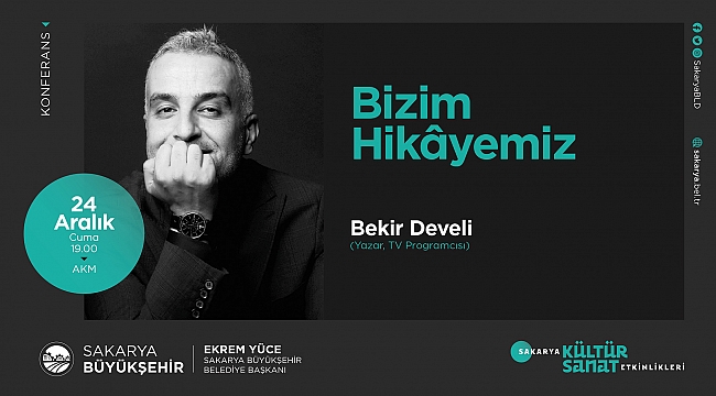Bekir Develi ile ‘Bizim Hikâyemiz’ AKM’deBüyükşehir Aralık Kültür Sanat Etkinlikleri 24 Aralık Cuma günü saat 19.00’da AKM’de gerçekleştirilecek ‘Bizim Hikâyemiz’ isimli konferans ile devam edecek.Sakarya Büyükşehir Belediyesi Aralık Kültür Sanat Etkinlikleri 24 Aralık Cuma günü gerçekleştirilecek ‘Bizim Hikâyemiz’ başlıklı konferans programı ile devam edecek. Yazar, TV Programcısı ve Sunucu Bekir Develi’nin konuşmacı olarak katılacağı konferans saat 19.00’da AKM’de başlayacak.