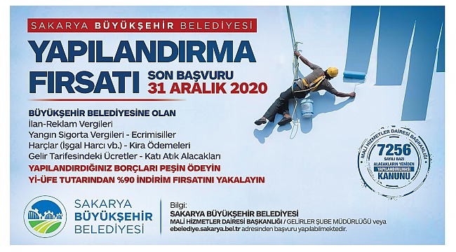 Sakarya Büyükşehir Belediyesi Mali Hizmetler Dairesi Başkanlığı Gelirler Şube Müdürlüğü tarafından, 11 Kasım Salı günü yürürlüğe giren 7256 Sayılı Bazı Alacakların Yeniden Yapılandırılmasına ilişkin kanun hakkında açıklama yapıldı. Vatandaşların yapılandırma kanunundan faydalanarak Büyükşehir Belediyesine olan birikmiş borçlarının kolaylıkla ödenebileceği, başvuruda bulunmak isteyen vatandaşların başvurularını 31 Aralık Perşembe gününe kadar Büyükşehir Belediyesi Gelirler Şube Müdürlüğüne şahsen veya posta aracılığıyla yapabilecekleri dile getirildi. Yapılandırma işlemlerinin Büyükşehir Belediyesi’nin resmi internet sayfası ebelediye.sakarya.bel.tr üzerinden de gerçekleştirilebileceği belirtildi.