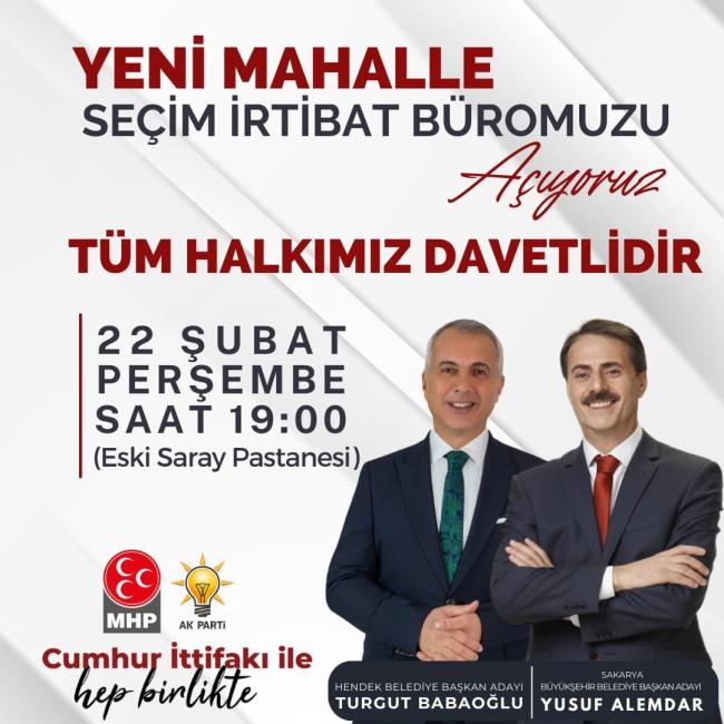 Hendek Belediye Başkanı ve Cumhur İttifakı Hendek Belediye Başkan Adayı Turgut Babaoğlu, Cumhur İttifakı Sakarya Büyükşehir Belediye Başkan Adayı Yusuf Alemdar seçim çalışmalarına Yenimahalle'de Seçim İrtibat Bürosu'nun açılışını gerçekleştirecek.Hendek Belediye Başkanı ve Cumhur İttifakı Hendek Belediye Başkan Adayı Turgut Babaoğlu, 22 Şubat Perşembe günü (bugün) gerçekleştirecekleri açılış törenine tüm Hendeklileri davet etti..