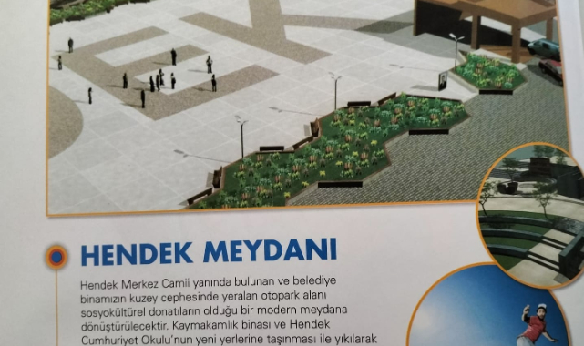 Ali İnci'nin söz verdiği HENDEK MEYDANI Projesiyle ilgili bilgileri eski başkanın ağzından dinleyelim. Eski başkan İnci; "Hendek Merkez Camii yanında bulunan ve belediye binamızın kuzey cephesinde yer alan otopark alanı, sosyokültürel donatıların olduğu bir modern meydana dönüştürülecektir. Kaymakamlık binası ve Hendek Cumhuriyet Okulununyeni yerlerine taşınmasıyla yıkılarak oluşturulan 22 bin m2 alanda kurulacak Hendek Meydanı; yürüyüş alanları, yeşil alanlar, oturma grupları, kaykay pisti, konser alanı vb. gibi sosyal donatılar içerecektir" Diye projesini tanıttı.