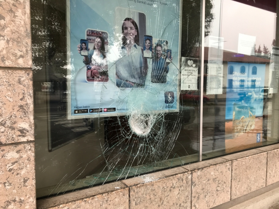 Edinilen bilgilere göre, Hendek Cumhuriyet Meydanında bulunan özel bir banka şubesinin iki camı ve bir işyeri camlarına kimliği henüz belirlenemeyen bir şahıs tarafından taşla saldırıda bulunuldu.
