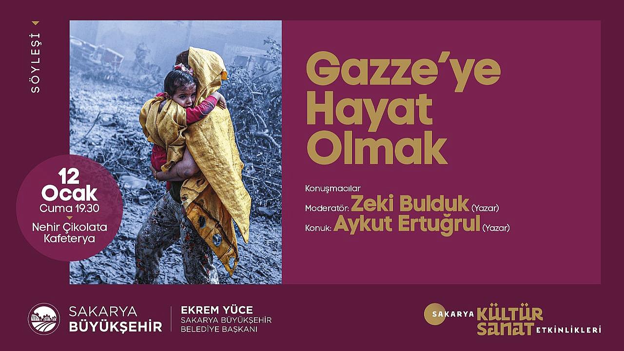Büyükşehir Ocak kültür sanat etkinlikleri ‘Gazze’ye Hayat Olmak’ isimli söyleşi ile devam edecek. 12 Ocak Cuma günü Nehir Çikolata Evi’nin ev sahipliği yapacağı etkinlik saat 19.30’da başlayacak.Sakarya Büyükşehir Belediyesi Ocak kültür sanat etkinlikleri ‘Gazze’ye Hayat Olmak’ isimli söyleşi programı ile devam edecek. 12 Ocak Cuma günü Nehir Çikolata Evi’nde gerçekleştirilecek etkinliğin moderatörlüğünü Yazar Zeki Bulduk üstlenecek. Konuşmacı olarak Yazar Aykut Ertuğrul’un katılacağı etkinlik saat 19.30’da başlayacak. Kültür ve Sosyal İşler Dairesi Başkanlığı’ndan yapılan açıklamada, “Ocak kültür sanat etkinliklerimiz kapsamında düzenleyeceğimiz ‘Gazze’ye Hayat Olmak’ isimli söyleşiye tüm kültür sanat dostları davetlidir” denildi.