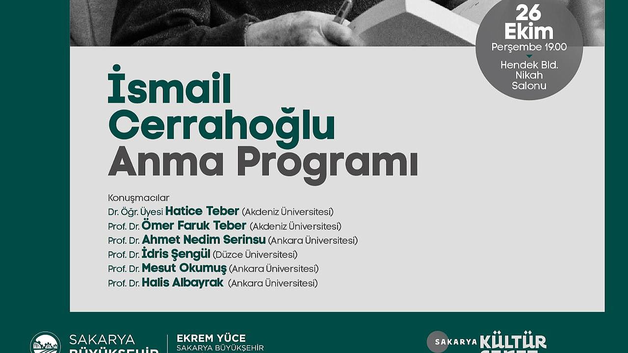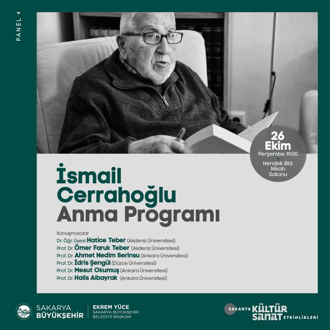 İSMAİL CERRAHOĞLU ANMA PANELİ Büyükşehir Belediyesi Ekim kültür sanat etkinlikleri 26 Ekim Perşembe günü İsmail Cerrahoğlu’nun anısına düzenlenecek panel ile devam edecek. Hendek Belediyesi Nikah Salonu’nda gerçekleştirilecek panel saat 19:00’da başlayacak.Sakarya Büyükşehir Belediyesi Ekim kültür sanat etkinlikleri İsmail Cerrahoğlu’nu anma programı ile devam edecek. 26 Ekim Perşembe günü Hendek Belediyesi Nikah Salonu’nda gerçekleştirilecek panele Prof. Dr. Ömer Faruk Teber, Prof. Dr. Ahmet Nedim Serinsu, Prof. Dr. İdris Şengül, Prof. Dr. Mesut Okumuş, Prof. Dr. Halis Albayrak ve Dr. Öğr. Üyesi Hatice Teber konuşmacı olarak katılacak. Hayatını ilmi çalışmalara adayan İsmail Cerrahoğlu’nun konuşulacağı program saat 19:00’da başlayacak. Kültür ve Sosyal İşler Dairesi Başkanlığı’ndan yapılan açıklamada, “Hendek Belediyesi Nikah Salonu’nda saat 19:00’da gerçekleştirilecek panelimize tüm kültür sanat dostları davetlidir” dedi.