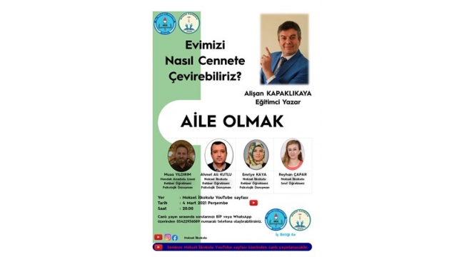 Eğitimci Yazar Alişan KAPAKLIKAYA tarafından 4 Mart 2021 Perşembe günü saat 20.00 da okul öncesi, ilkokul, ortaokul ve lisede öğrenim gören öğrenci velilerine yönelik seminer verilecektir."EVİMİZİ NASIL CENNETE ÇEVİREBİLİRİZ?" konulu seminer Noksel İlkokulu YouTube sayfasından canlı yayınlanacaktır.Seminer moderatörlüğünü Hendek Anadolu Lisesi Rehber Öğretmeni Musa YILDIRIM, Noksel İlkokulu Rehber Öğretmeni Ahmet Ali KUTLU, Noksel İlkokulu Rehber Öğretmeni Emriye KAYA ve Noksel İlkokulu Sınıf Öğretmeni Reyhan ÇAPAR yapacaklar.Seminere tüm öğretmenlerimiz, velilerimiz ve halkımız davetlidir.Seminer sırasında öğretmenlerimiz, velilerimiz, misafirlerimiz ve halkımız sorularını WhatssApp ve BİP üzerinden 05422936089 numaralı telefona mesaj gönderebilecek ve cevaplanmasını isteyebilecekler.İmkanlar ölçüsünde de seminer sırasında öğretmenlerimiz, velilerimiz ve misafirlerimiz sorularını canlı yayına bağlanarak Eğitimci Yazar Alişan KAPAKLIKAYA’ya sorabileceklerdir.Noksel İlkokulu YouTube Sayfası Linki:https://www.youtube.com/channel/UCro7fw3wNCk7ziWiWZh47hg