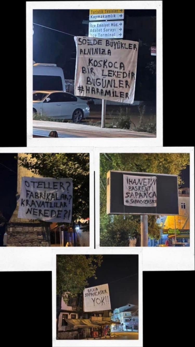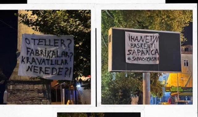 SAPANCASPOR TARAFTARLARINDAN İLGİNÇ PANKARTLARTurizmde Türkiye'nin gözbebeği olan ve son yıllarda bungalov turizmi ile ülke gündeminden düşmeyen Sapanca, bu sefer de ilçenin ana arterlerine Sapancaspor'la ilgili asılan ilginç pankartlarla gündeme geldi.SAPANCASPOR KRİZİ SONRASI TEPKİLER BÜYÜYORTFF 3. Lig'de yer alan Sapancaspor'un zor zamanlardan geçerken, Başkan Adil Köseoğlu istifa etti. Başkan Köseoğlu'nun istifasının ardından kulüp kayyım tehlikesiyle karşı karşıya kaldı. Bu olaylar sonrası bir grup taraftar, Sapanca şehrinin ana arterlerine pankart asarak şehirdeki iş adamlarına ve otel sahiplerine tepki gösterdi.SERT İFADELERAsılan pankartlarda, "Oteller, fabrikalar, kravatlılar nerede?" ve "İhanetin başkenti Sapanca" gibi sert ifadelerle otel ve fabrika sahipleri eleştirildi.Gece saatlerinde asılan bu pankartlar sabaha karşı sabaha karşı Sapanca Belediyesi zabıta ekiplerinin yapmış olduğu operasyonla söküldü.