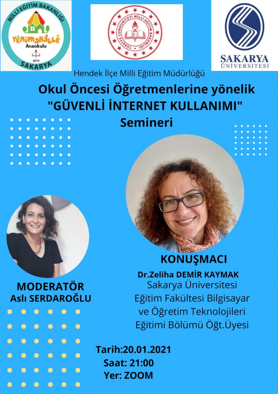 20 Ocak 2021 Çarşamba günü Hendek İlçe milli Eğitim Müdürlüğü koordinesinde, Sakarya Üniversitesi ve Yenimahalle Anaokulu işbirliği ile zoom programı üzerinden çevrimiçi seminer düzenlendi.