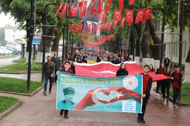 19 Mayıs Atatürk’ü Anma Gençlik ve Spor Bayramı kutlamaları İlçe Protokolü, Öğretmen ve öğrencilerin katılımıyla Gençlik Yürüyüşüyle başladı.
