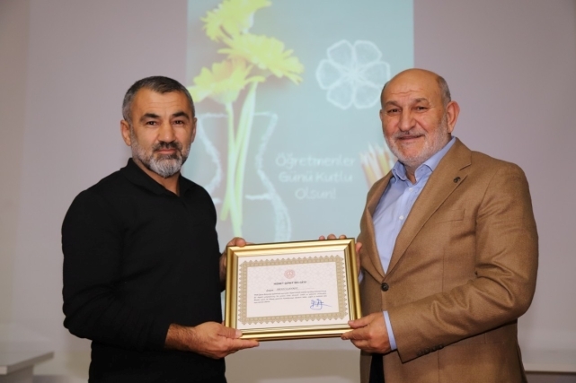 24 KASIM ÖĞRETMENLER GÜNÜ TÖRENLE KUTLANDIHendek’te 24 Kasım Öğretmenler günü bir dizi etkinlikle kutlandı. Hendek Kaymakamlığı önünde bulunan Atatürk anıtına çelenk sunulmasıyla başlayan program ardından Ticaret Merkezi Konferans Salonunda devam etti.KAYMAKAMLIK BİNASI ÖNÜNDEİlçe protokolü, sivil toplum kuruluşları temsilcileri, öğretmen ve öğrencilerin katılımlarıyla Hendek Kaymakamlığı önünde 24 Kasım Öğretmenler günü nedeniyle tören düzenlendi. Düzenlenen törende Atatürk Anıtı’na Hendek İlçe Milli Eğitim Müdürü Murat Çekiçcioğlu tarafından çelenk sunuldu. Saygı duruşu ve İstiklal Marşı’nın okunmasıyla başlayan etkinlik daha sonra Hendek Ticaret Merkezi Konferans salonunda devam etti.ETKİNLİK VE ÖDÜL TÖRENİHendek Kaymakamlık binası önündeki törenin ardından protokol üyeleri Hendek Ticaret Merkezi Konferans salonunda düzenlenen etkinlikte bir araya geldi.Hendek İlçe Milli Eğitim Müdürü Murat Çekiçcioğlu günün anlam ve önemini belirten konuşmasının ardından Şehit Mahmutbey Ortaokulu Aday Öğretmeni Seda Eliküçük, yemin ederek yeni atanan öğretmenler adına konuşma yaptı.Program video gösterimi, öğrencilerin koro olarak saz eşliğinde türkü söylemesi ve şiir okuması ile devam etti.Daha sonra emekli olan öğretmenler adına Hendek Kaymakamı Hacı Hasan Gökpınar ve Hendek Belediye Başkanı İrfan Püsküllü tarafından Hizmet Şeref Belgelerinin takdimi yapıldı. Son olarak çeşitli yarışmalarda dereceye giren öğretmenlere ödülleri takdim edilerek program son buldu.
