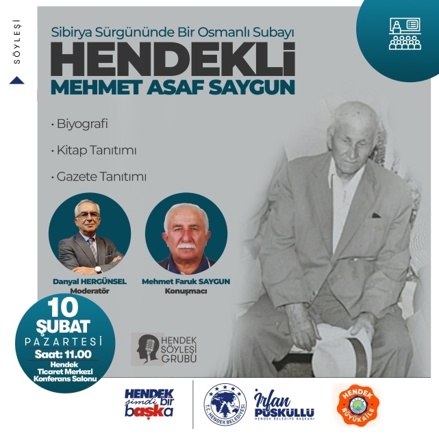 HENDEKLİ MEHMET ASAF SAYGUN ANISINA KONFERANS DÜZENLENDİ.10-02-2024 Pazartesi saat 11:00'de Hendek Ticaret Merkezi Konferans Salonunda Hendek Belediyesi ve Hendek Söyleşi Gurubu ortak çalışmasıyla konferans düzenlendi. Düzenlenen konferansta 1.Dünya Savaşında Kafkas Cephesinde Ruslara karşı savaşırken Gümüşhanenin Güzyurdu Köyünde esir düşen Mehmet Asaf Saygun'un hayatı anlatıldı.Konferans programını; Ereğli Demirçelik Fabrikası müdürlüğünden emekli Dr.Yük. Mühendis Danyal Hergünsel moderatör olarak sunarken, Merhum Mehmet Asaf Beyin torunu, ilçemizde uzun yıllar görev yapan emekli Tarih öğretmeni Faruk Saygun konuşmacı olarak katıldı. Mehmet Asaf Bey, 1.Dünya Savaşında Kafkas Cephesinde Ruslara karşı savaşırken Gümüşhane'nin Güzyurdu Köyünde esir edilmiştir.Esirler Ruslar tarafından trenlere doldurularak , Volga nehirinin Sibirya'ya bakan kısmında Vetluga denilen yerde tutulmuşlardır.Esaret hayatında hem günlük tutmuş, hem de NİYET isimli bir Gazete çıkarmıştır. Niyet gazetesinin 25 adedi mevcuttur. Bu Gazetelerin transkripsiyon (Osmanlıca'dan Türkçe'ye çeviri )işlemi bitmiştir.Dünyaca ünlü Kalp Cerrahı Prof.Dr.BİNGÜR SÖNMEZ hoca "NİYET"Gazeteleri ile yakından ilgilenmiş. Bingür Sönmez Hocanın Sarıkamışl'ı oluşu ve tarihe yakın ilgisi nedeniyle Mehmet Asaf Bey'e yakın ilgi duymuştur. Beş adet Sarıkamış Harekatı ile ilgili kitabı yayımlanmıştır.Mehmet Asaf Bey'in hayatının anlatıldığı konferansa yoğun katılım oldu. Moderatör Dr.Yüksek Mühendis Danyal Hergünsel ve konuşmacı Emekli Tarih Öğretmeni Faruk Saygun, Lise öğrencilerinin Konferansa ilgi göstermelerinden ötürü mutluluk duyduklarını söyleyerek, Hendek Belediye Başkanı İrfan Püsküllü ve Hendek Söyleşi Gurubuna teşekkür etti.