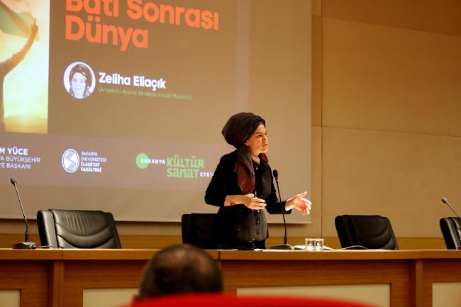 Sakarya Büyükşehir Belediyesi Aralık ayı Kültür Sanat Etkinlikleri “Batı Sonrası Dünya” konulu konferans ile devam etti. SAÜ İlahiyat Fakültesi Konferans Salonu’nda gerçekleştirilen konfernasa konuşmacı olarak Anadolu Ajansı Stratejik Analiz Müdürü Zeliha Eliaçık katıldı.