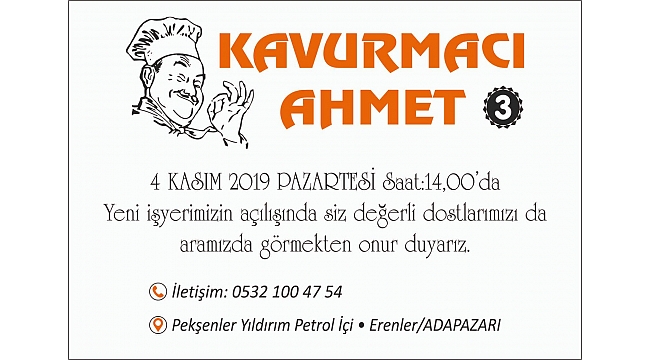 Kavurmacı Ahmet üçüncü şubesini 4 Kasım Pazartesi günü Saat 14:00’da Erenler ilçesi Pekşenler Yıldırım Petrol tesisleri içerisinde düzenlenecek törenle hizmete açacak. Küçük ailesi Pazartesi günü gerçekleştirecekleri açılışa herkesi davet ettiler.
