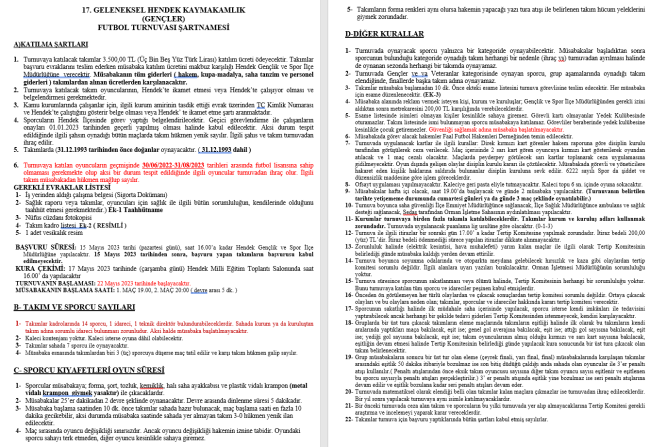 Geleneksel hale gelen ve bu yıl 17. si düzenlenecek olan Hendek Kaymakamlık Futbol Turnuvası , Hendek Kaymakamı Halil İbrahim Acır’ ın olurlarıyla 22 Mayıs 2023 tarihinde başlayacak. Gençler ve Veteranlar olarak iki kategoride yapılacak turnuvanın başvuruları 15 Mayıs 2023 tarihine kadar devam edecek. Turnuvanın fikstürü 17 Mayıs 2023 tarihinde Hendek İlçe Milli Eğitim Müdürlüğü toplantı salonunda yapılacak.