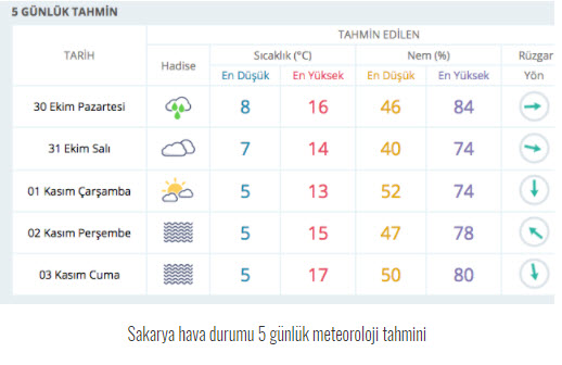 TÜRKİYE Balkanlar üzerinden gelen soğuk ve yağışlı havanın etkisine girerken kış kapıya dayandı. Meteorolojinin yayınladığı son hava durumu tahminine göre sıcaklık mevsim normallerinin de altına indi. Bu hafta sonuna kadar soğuk havanın ülkemizin büyük bir bölümünde etkili olması bekleniyor. Bugün için yapılan hava durumu tahmininde ise Marmara'nın güney ve doğusu, Doğu Akdeniz, İç Anadolu'nun kuzeyi, Karadeniz, Doğu ve Güneydoğu Anadolu ile Kütahya çevrelerinin yağışlı geçeceği tahmin ediliyor. Doğu Karadeniz'in iç kesimlerinin ve Doğu Anadolu’nun doğusunun yükseklerinde karla karışık yağmur ve kar yağışı bekleniyor. İşte SAKARY'nın 5 günlük hava durumu tahmini
