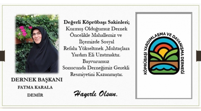Köprübaşı Yardımlaşma ve Dayanışma Derneği kuruldu. Dernek Başkanlığına Fatma Karala Demir getirildi. Yönetim Kurulu, Alirıza Albayrak, Murat Bıçakçı, Yunus Demir, Aykut Talha Dertli, Canan Karala, Nejla Çakar'dan oluştu.