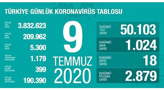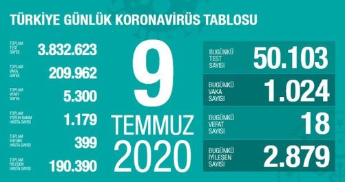 Sağlık Bakanlığı internet sitesinde yer alan ve Bakan Fahrettin Koca'nın da Twitter'dan paylaştığı 9 Temmuz 2020 'Türkiye Günlük Koronavirüs Tablosu'nun güncel verilerine göre; 50 bin 103 yeni test yapıldı, 1024 kişiye Kovid-19 tanısı konuldu. Son 24 saatte 18 hasta vefat etti, 2879 kişi iyileşti.