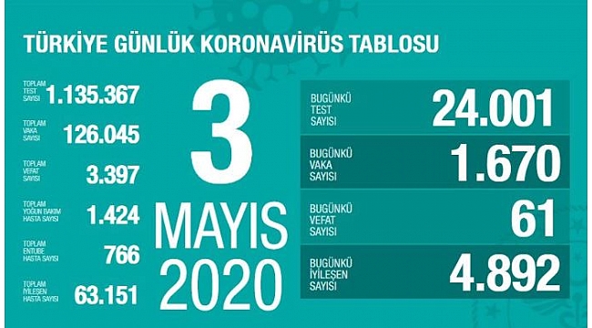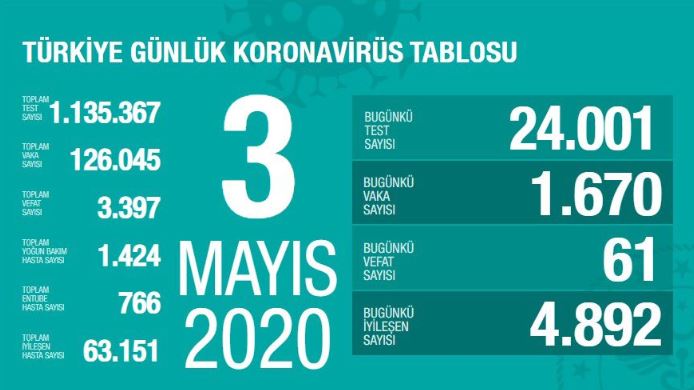 Toplam test sayısı 1.135.367, toplam vaka sayısı 126.045, toplam vefat sayısı 3.397, toplam yoğun bakımdaki hasta sayısı 1.424, toplam solunum cihazına bağlı hasta sayısı 766, toplam iyileşen hasta sayısı da 63.151 oldu.