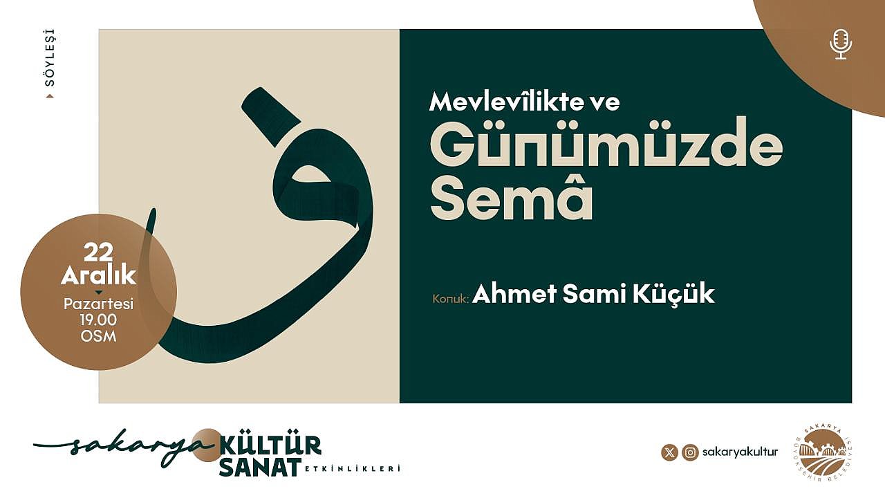 “Mevlevilikte ve Günümüzde Sema” söyleşisi OSM’deBüyükşehir Aralık Kültür Sanat Takvimi kapsamında düzenlenen “Mevlevilikte ve Günümüzde Sema” söyleşisi, 22 Aralık Pazartesi günü (bu akşam) saat 19.00’da Ofis Sanat Merkezi’nde gerçekleştirilecek.Sakarya Büyükşehir Belediyesi Kültür ve Sosyal İşler Dairesi Başkanlığı tarafından düzenlenen Aralık Kültür Sanat Takvimi, tasavvuf kültürünün önemli başlıklarından biri olan “Mevlevilikte ve Günümüzde Sema” konulu söyleşiyle, sanat ve kültür dostlarını bir araya getirecek.Alanında önemli çalışmalara imza atan Ahmet Sami Küçük’ün konuk olacağı program, 22 Aralık Pazartesi günü saat 19.00’da Ofis Sanat Merkezi (OSM)’de gerçekleştirilecek.Mevleviliğe kapsamlı bakışSöyleşide, Mevlevilik geleneği içerisinde semanın tarihsel ve düşünsel boyutu ele alınırken, semanın günümüzdeki yeri ve anlamı da farklı yönleriyle değerlendirilecek. Katılımcılar, semanın taşıdığı manevi derinlik ve kültürel miras üzerine kapsamlı bir bakış açısı edinme fırsatı bulacak.