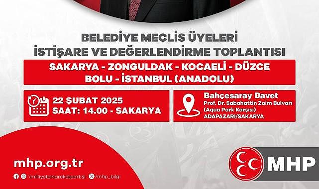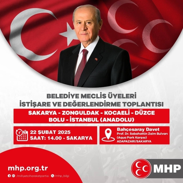 MHP SAKARYA İL BAŞKANLIĞINDAN BASINA DAVET22 ŞUBAT 2025 CUMARTESİ (YARIN) GÜNÜ SAAT 14:00'TE YEREL YÖNETİMLERDEN SORUMLU GENEL BAŞKAN YARDIMCIMIZ SN SADİR DURMAZ BEYİN BAŞKANLIĞINDA, SAKARYA, İSTANBUL, KOCAELİ, DÜZCE, BOLU VE ZONGULDAK İLLERİMİZİN MİLLETVEKİLLERİ, İL BAŞKANLARI VE BELEDİYE MECLİS ÜYELERİ'NİN KATILIMLARIYLA YAPACAĞIMIZ "BELEDİYE MECLİS ÜYELERİ İSTİŞARE VE DEĞERLENDİRME '' TOPLANTIMIZA SİZ DEĞERLİ BASIN MENSUPLARINI DAVET EDER, İLGİNİZ İÇİN ŞİMDİDEN TEŞEKKÜR EDERİZ YER: BAHÇESARAY DAVET VE TOPLANTI SALONU(KARAMAN YOLU-AQUAPARK KARŞISI)SAAT: 14:00OĞUZ ALKAŞMHP SAKARYA İL BAŞKANI