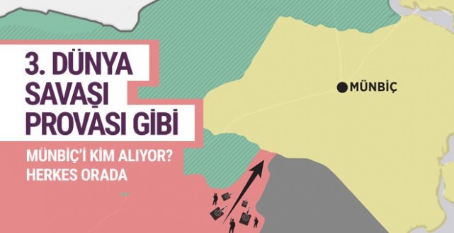 Münbiç ile ilgili geçen haftadan beri çok önemli gelişmeler yaşanıyor. TSK El Bab'ı aldıktan sonra namluyu 'çık' ihtarında bulunduğu Münbiç'deki PYD unsurlarına çevirdi. Münbiç'in iki köyü de geçen hafta TSK destekli ÖSO tarafından alındı. Şu anda Münbiç'in sınırlarının içinde TSK unsurları bulunuyor. Sadece Türkiye değil. Münbiç'te aslında küçük çaplı bir dünya savaşı yaşanıyor. ABD, Rusya, İran, Fransa, İngiltere ve elbette Esed ile Kürt güçleri de Münbiç'te... Fransa ve İngiltere'nin burada askeri üsleri bulunurken diğer ülkelerin de ellerinde irili ufaklı köyler ve toprak parçaları bulunuyor. İşte Münbiç'deki son durum;
