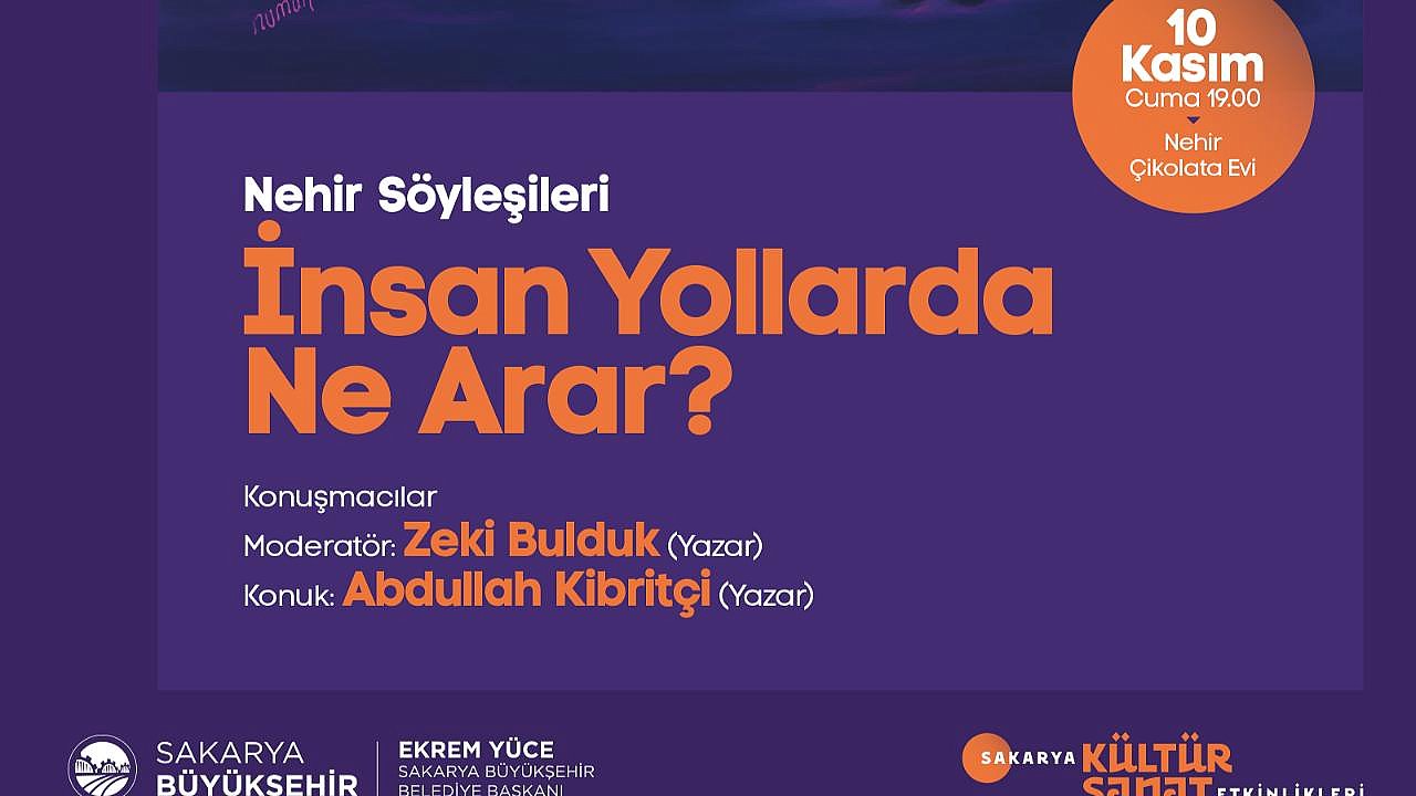 Büyükşehir Kasım kültür sanat etkinlikleri ‘İnsan Yollarda Ne Arar?’ isimli söyleşi ile devam edecek. 10 Kasım Cuma günü Nehir Çikolata Evi’nin ev sahipliği yapacağı etkinlik saat 19.00’da başlayacak.Sakarya Büyükşehir Belediyesi Kasım kültür sanat etkinlikleri ‘İnsan Yollarda Ne Arar?’ isimli söyleşi programı ile devam edecek. Nehir Söyleşileri kapsamında 10 Kasım Cuma günü Nehir Çikolata Evi’nde gerçekleştirilecek etkinliğin moderatörlüğünü Yazar Zeki Bulduk üstlenecek. Konuşmacı olarak Yazar Abdullah Kibritçi’nin katılacağı etkinlik saat 19.00’da başlayacak. Kültür ve Sosyal İşler Dairesi Başkanlığı’ndan yapılan açıklamada, “Kasım kültür sanat etkinliklerimiz kapsamında düzenleyeceğimiz ‘İnsan Yollarda Ne Arar?’ isimli söyleşiye tüm kültür sanat dostları davetlidir” denildi.