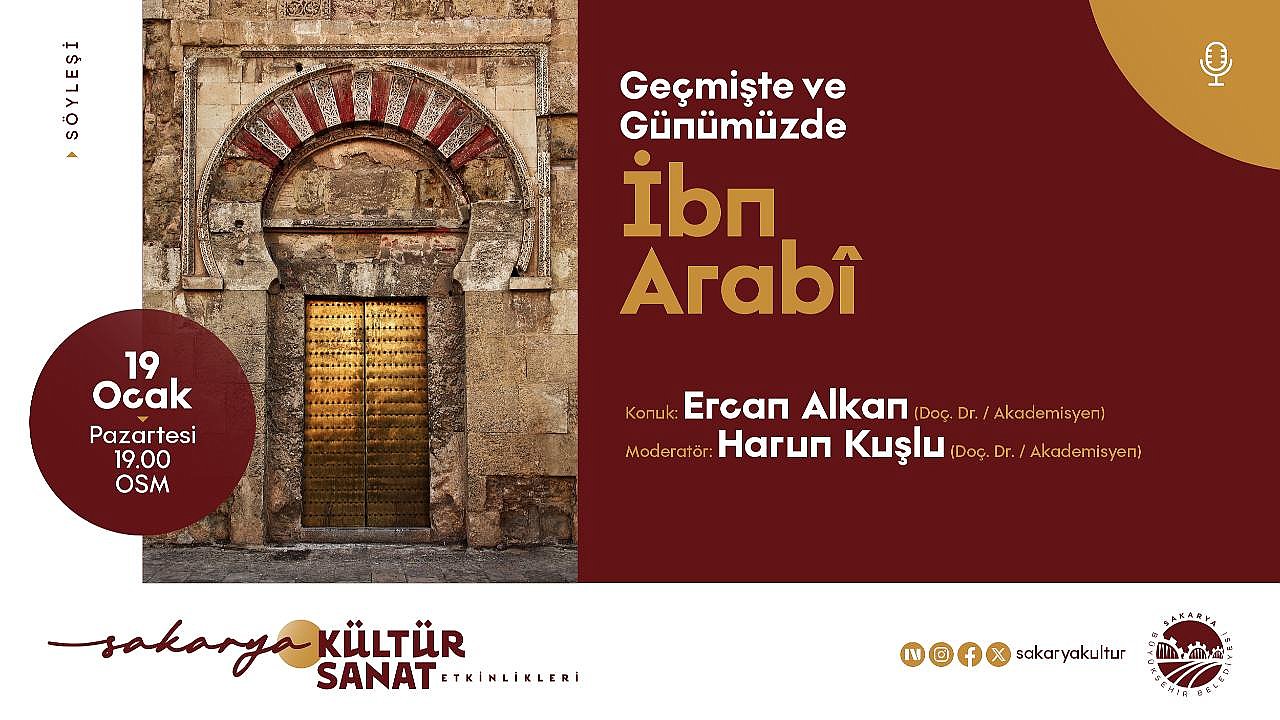 OSM’de İbn Arabi’nin düşünce yolculuğu ele alınacakBüyükşehir Ocak Kültür Sanat takvimi 19 Ocak Pazartesi günü OSM’de düzenlenecek “Geçmişte ve Günümüzde İbn Arabi” adlı söyleşi programıyla devam edecek. Doç. Dr. Ercan Alkan konuşmacı olarak katılacağı program saat 19.00’da başlayacak.Sakarya Büyükşehir Belediyesi Kültür ve Sosyal İşler Dairesi Başkanlığı tarafından düzenlenen Ocak Kültür sanat takvimi yeni haftaya düşünce ve tasavvuf dünyasına ışık tutacak bir söyleşi programıyla başlayacak.19 Ocak Pazartesi günü Ofis Sanat Merkezi’nde “Geçmişte ve Günümüzde İbn Arabi” adlı söyleşi programı gerçekleştirilecek. Saat 19.00’da başlayacak programa Doç. Dr. Ercan Alkan konuşmacı olarak katılacak. Söyleşinin moderatörlüğünü ise Doç. Dr. Harun Kuşlu üstlenecek.Hayatı, eserleri ve düşünce dünyası konuşulacakProgramda, İslam düşünce tarihinin en önemli mutasavvıflarından biri olan İbn Arabi’nin hayatı, eserleri, tasavvuf anlayışı ve düşünce sisteminin günümüz dünyasına etkileri kapsamlı şekilde ele alınacak.