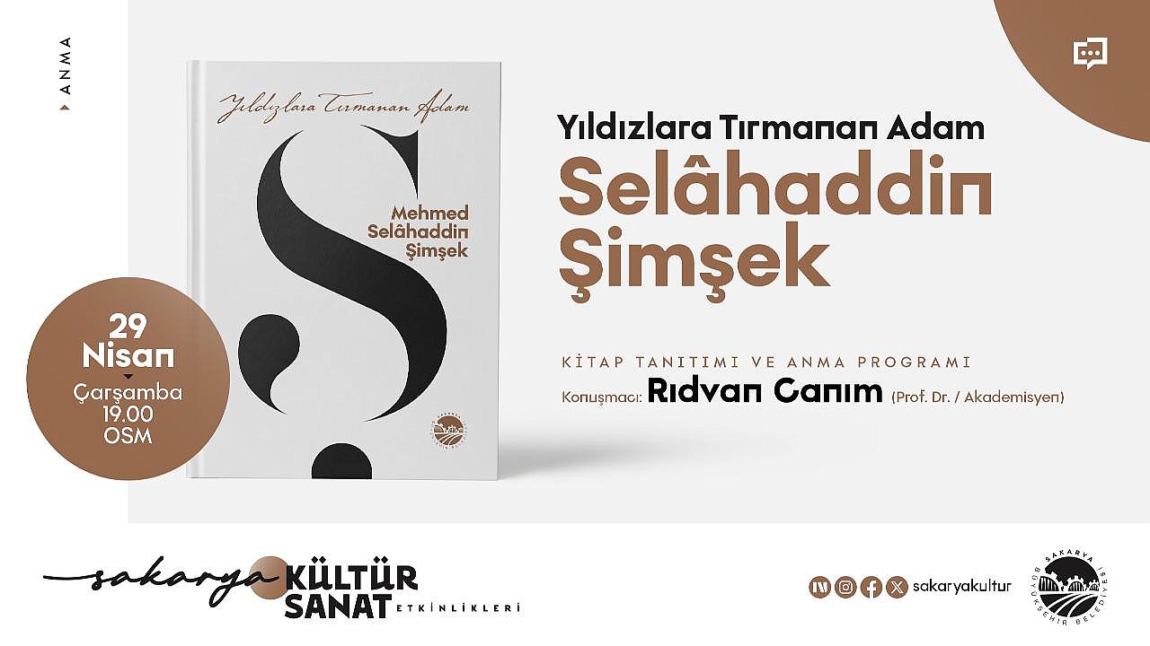 Özdeyiş Yazarı Selahaddin Şimşek anılacak: “Yıldızlara Tırmanan Adam” programı OSM’deBüyükşehir Nisan Kültür Sanat Takvimi, Sakaryalı özdeyiş sanatçısı ve Yazar Selahaddin Şimşek’i anma programıyla devam edecek. 29 Nisan Çarşamba günü OSM’de düzenlenecek “Yıldızlara Tırmanan Adam” kitap tanıtımı ve anma programına Prof. Dr. Rıdvan Canım konuşmacı olarak katılacak. Program saat 19.00’da başlayacak.Sakarya Büyükşehir Belediyesi Nisan kültür sanat etkinlikleri kapsamında, edebiyat ve kültür dünyasına değer katan isimleri özel programlarla anıyor.Bu kapsamda Nisan kültür sanat takvimi 29 Nisan Çarşamba günü, Sakaryalı özdeyiş sanatçısı ve yazar Mehmet Selahaddin Şimşek’i anma programıyla devam edecek.Eserleri ve edebiyat dünyasına bıraktığı iz konuşulacakOfis Sanat Merkezi’nde düzenlenecek “Yıldızlara Tırmanan Adam: Selahaddin Şimşek” adlı program saat 19.00’da başlayacak. Prof. Dr. Rıdvan Canım’ın konuşmacı olarak katılacağı programda hem kitap tanıtımı yapılacak hem de anma programı düzenlenecek. Prof. Dr. Canım hem esere dair değerlendirmelerde bulunacak hem de Şimşek’in kültür ve edebiyat dünyasına bıraktığı izleri aktaracak.