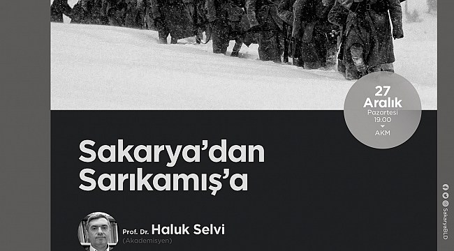 Sakarya’dan Sarıkamış’a Konferansı AKM’deBüyükşehir Aralık Kültür Sanat Etkinlikleri, 27 Aralık Pazartesi günü gerçekleştirilecek Sakarya’dan Sarıkamış’a isimli konferans ile devam edecek. Prof. Dr. Haluk Selvi’nin konuşmacı olarak katılacağı program AKM’de saat 19.00’da başlayacak.Sakarya Büyükşehir Belediyesi Aralık Kültür Sanat Etkinlikleri, 27 Aralık Pazartesi günü gerçekleştirilecek Sakarya’dan Sarıkamış’a isimli konferans ile devam edecek. AKM’de saat 19.00’da gerçekleştirilecek olan programa Prof. Dr. Haluk Selvi konuşmacı olarak katılacak. Kültür ve Sosyal İşler Dairesi Başkanlığı’ndan yapılan açıklamada, Sarıkamış Harekatı’nın 107. Yılı dolayısıyla düzenlenecek etkinliğe tüm kültür sanat dostları davet edildi.