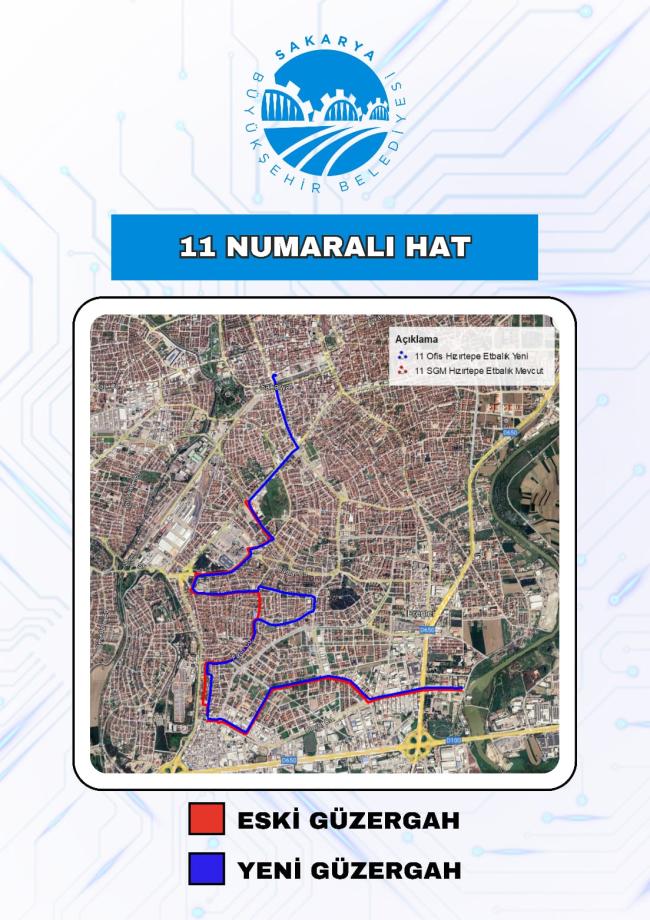 Büyükşehir Belediyesi, toplu taşıma hatlarına yeni hat daha eklerken bazı hatlarda değişikliğe gitti. Kuzey Terminal-Serdivan-Kampüs güzergahında çalışacak 16-K numaralı hat devreye alınırken 11 ve 28 numaralı hatlarda ise değişikliğe gidildi. Yeni düzenlemelerle hatlar seferlerine 4 Eylül Perşembe gününden itibaren hizmet vermeye başlayacak.Sakarya Büyükşehir Belediyesi, toplu taşıma hatlarında yeni bir hattı hizmete alırken bazı hatlarda ise değişikliğe gitti. Tüm değişiklikler 4 Eylül Perşembe günü uygulanmaya başlayacak.Kuzey Terminal’den Kampüs’e yeni bir hatŞehrin dört bir yanında vatandaşlardan gelen talepleri ve yolcu potansiyelini dikkate alan Büyükşehir Belediyesi, Kuzey Terminal-Serdivan ve Kampüs güzergahında çalışmak üzere “16-K” adlı yeni bir toplu taşıma hattını devreye alıyor.Yeni hattın yanı sıra mevcuttaki bazı hatlarda ise güzergâh değişikliğine gidildi. Buna göre “11” Numaralı Hızırtepe-Et Balık hattı yeni düzenlemeyle Ofis Garaj’dan değil SGM’den kalkış yaparak Et Balık’a ulaşacak.28 numara Serdivan’ı dolaşacakBir diğer değişiklik ise Kuzey Terminal ile Yeni Terminal arasında sefer yapan hatta yapıldı. Buna göre “28” Numaralı hat artık “28-A” ve “28-B” olmak üzere iki farklı hatta dönüştürüldü. Buna göre A ve B hatları Yazlık Kavşağı’dan Serdivan AVM’ye ardından Tunatan Kavşağı’na uzanarak mevcut güzergâha ulaşacak.Açılan yeni hat ve güzergâh değişikliğine gidilen hatların saat ve güzergâh bilgilerine SAKUS’tan kolaylıkla ulaşılabilecek. Tüm yeni düzenlemeler ise 4 Eylül Perşembe gününden itibaren uygulanmaya başlayacak.Yeni düzenlemeler 4 Eylül’de hizmete girecekKonu ile ilgili Ulaşım Dairesi Başkanlığı’ndan yapılan açıklamada, “Vatandaşlarımızdan gelen talepler ve artan yolcu yoğunluğu nedeniyle toplu taşıma hatlarımıza yeni hat eklemesi yapılmış bazı hatlarımızda ise güzergâh değişikliğine gidilmiştir. Yapılan tüm değişiklikler SAKUS mobil uygulaması ve web sitesi üzerinden detaylı şekilde takip edilebilir. Değişiklikler 4 Eylül Perşembe gününden itibaren geçerli olacaktır” ifadelerine yer verildi.
