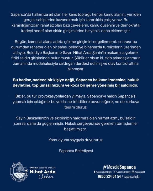 Sapanca Belediye başkanı Nihat Arda Şahin’e, bugün akşam saatlerinde fiziksel saldırı girişiminde bulunuldu. Saldırı girişimini Sapanca Belediyesi basın açıklaması ile duyurdu.