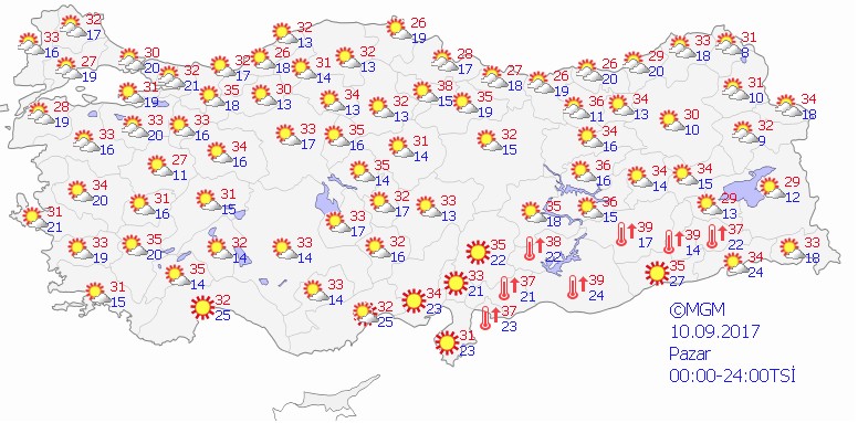 Ülkemizin kuzey ve iç kesimlerinin parçalı yer yer çok bulutlu, Marmara'nın doğusu, İç Anadolu'nun kuzey ve doğusu, Doğu Akdeniz'in iç kesimleri ve Karadeniz Bölgesinin yerel olmak üzere sağanak ve gök gürültülü sağanak yağışlı, diğer yerlerin az bulutlu ve açık geçeceği tahmin ediliyor. Yağışların; Sakarya, Düzce, Bolu, Zonguldak, Bartın, Çankırı, Çorum, Kastamonu, Sinop, Rize, Karabük'ün kuzey, Amasya'nın batı, Trabzon'un doğu ve Artvin'in kıyı kesimlerinde kuvvetli olması bekleniyor. Rüzgarın; Ege'nin güneyi ve Batı Akdeniz'in batısında kuzey yönlerden kuvvetlice (30-50km/sa), Doğu Anadolu'nun iç kesimlerinde güney yönlerden kuvvetli (40-60km/sa) olarak eseceği tahmin ediliyor. Hafta sonuna doğru ise sıcaklıklar yeniden 30 derecenin üzerine çıkıyor. Yurdun birçok bölgesinde sıcak ve aşırı sıcaklar etkili olacak.
