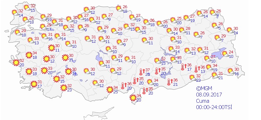 Tüm yurtta gelecek hafta sıcaklıklar hissedilir derecede artarak, mevsim normallerinin 5-9 derece üzerine çıkacak. Meteoroloji Genel Müdürlüğünden yapılan yazılı açıklamaya göre, gelecek hafta yurt genelinde sıcak hava dalgasının etkili olması bekleniyor. Gelecek hafta sonuna kadar yağış beklenmezken, bütün bölgelerde havanın açık ve az bulutlu olacağı öngörülüyor. Hava sıcaklıklarının tüm yurtta hissedilir derecede artacağı ve mevsim normallerinin 5-9 derece üzerinde seyredeceği tahmin ediliyor. Bu hafta sonu ve gelecek hafta boyunca en yüksek hava sıcaklığının Diyarbakır ve Şanlıurfa'da 40, Aydın ve Bursa'da 37, Adana ve Antalya'da 36, Ankara ve İzmir'de 35, Konya ve Afyonkarahisar'da 34, İstanbul'da 33, Samsun, Trabzon ve Erzurum'da 31 derece olması bekleniyor.