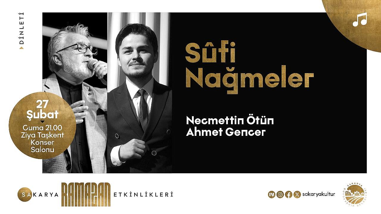 Büyükşehir Ramazan Kültür Sanat Takvimi, 27 Şubat Cuma günü Necmettin Ötün ve Ahmet Gencer’in sahne alacağı ‘Sufi Nağmeler’ adlı dinleti programıyla devam edecek. Etkinlik Ziya Taşkent Konser Salonu’ndan saat 21.00’da başlayacak.Sakarya Büyükşehir Belediyesi, Ramazan ayının manevi iklimini zenginleştiren kültürel etkinliklerine hız kesmeden devam ediyor. Bu kapsamda 27 Şubat Cuma günü, “Sufi Nağmeler” programıyla müzikseverleri huzurlu bir akşam bekliyor.Tasavvuf müziğin usta isimleriZiya Taşkent Konser Salonu’nda düzenlenecek dinleti programında Ses sanatçıları Necmettin Ötün ve Ahmet Gencer sahne alacak. Saat 21.00’da başlayacak etkinlikte usta isimler tasavvuf musikisinin seçkin eserlerinin seslendirerek dinleyicilere huzurlu bir Ramazan akşamı sunacak.