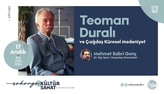 “Teoman Duralı ve Çağdaş Küresel Medeniyet” OSM’de konuşulacakBüyükşehir Aralık Kültür Sanat Etkinlikleri, 17 Aralık Salı günü “Teoman Duralı ve Çağdaş Küresel Medeniyet” adlı söyleşiyle devam edecek. OSM’de düzenlenecek etkinlik saat 19.00’da başlayacak.Sakarya Büyükşehir Belediyesi Kültür ve Sosyal İşler Dairesi tarafından sürdürülen Aralık Kültür Sanat Etkinlikleri, “Teoman Duralı ve Çağdaş Küresel Medeniyet” adlı söyleşiyle devam edecek.17 Aralık Salı günü Ofis Sanat Merkezi’nde düzenlenecek söyleşiye, Gaziantep Üniversitesi Dr. Ögr. Üyesi Mehmet Sabri Genç konuşmacı olarak katılacak.Saat 19.00’da başlayacak programda Türk Filozof ve akademisyen Teoman Duralı’nın hayatı ve felsefesi konuşulacak.