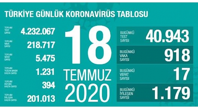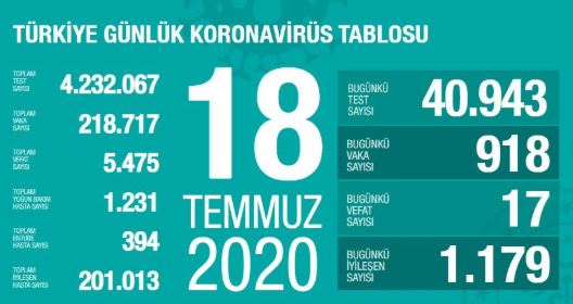 Son 24 saatte tedavisi tamamlanan bin 179 hastanın daha taburcu olmasıyla, toplam iyileşen hasta sayısı 201 bin 13'e yükseldi. Toplam test sayısı 4 milyon 232 bin 67, entübe (solunum cihazına bağlı) hasta sayısı 394, yoğun bakımdaki hasta sayısı ise bin 231 oldu.