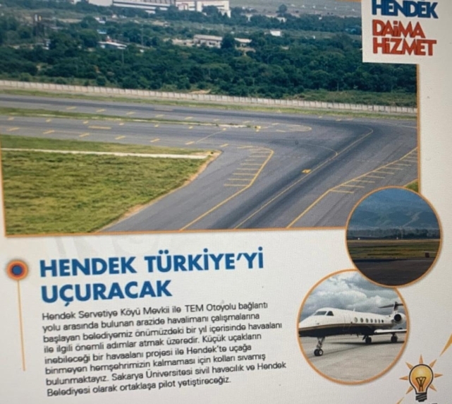 Eski başkan Ali İnci, havalimanı projesini anlatan proje kitapçığında; "Hendek Servetiye köyü mevkii ile TEM Otoyolu bağlantı yolu arasında bulunan arazide havalimanı çalışmalarına başlayan belediyemiz, önümüzdeki bir yıl içerisinde havaalanı ile ilgili önemli adımlar atmaktadır. Küçük uçakların inebileceği havaalanı projesiyle, Hendek'te uçağa binmeyen hemşehrimiz kalmaması için kolları sıvamış bulunmaktayız. Sakarya Üniversitesi Sivil Havacılık ve Hendek Belediyesi olarak ortak pilot yetiştereceğiz." Dedi.