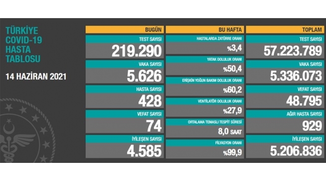 Türkiye'de son dakika corona virüsü gelişmelerini, vaka ve ölüm sayılarını her akşam paylaşan Sağlık Bakanı Dr. Fahrettin Koca, 14 Haziran 2021 günü vaka ve ölüm sayıları hakkında güncel bilgileri yaptığı son dakika açıklaması ile duyurdu.Bakan Koca 14 Haziran 2021 günü 5,626 vakaya rastlandığını açıkladı.