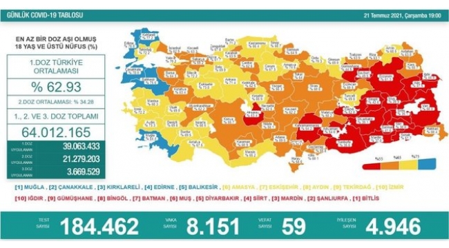 Türkiye'de son dakika corona virüsü gelişmelerini, vaka ve ölüm sayılarını her akşam paylaşan Sağlık Bakanı Dr. Fahrettin Koca, 21 Temmuz Çarşamba günü vaka ve ölüm sayıları hakkında güncel bilgileri yaptığı son dakika açıklaması ile duyurdu.Bakan Koca 21 Temmuz Çarşamba günü 8 bin 151 vakaya rastlandığını açıkladı. Koca ayrıca 59 vatandaşımızın hayatını kaybettiğini açıkladı.