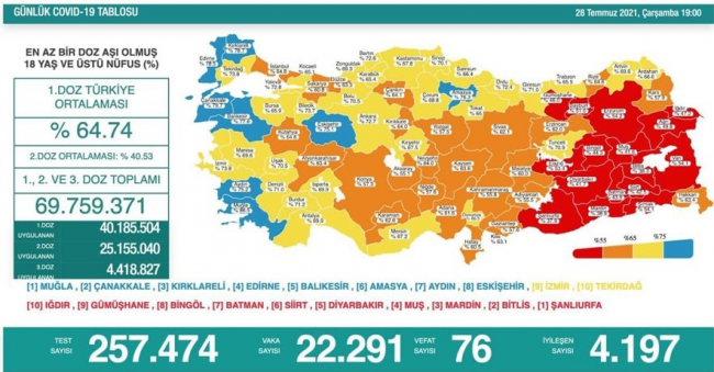 Türkiye'de son dakika corona virüsü gelişmelerini, vaka ve ölüm sayılarını her akşam paylaşan Sağlık Bakanı Dr. Fahrettin Koca, 28 Temmuz Çarşamba günü vaka ve ölüm sayıları hakkında güncel bilgileri yaptığı son dakika açıklaması ile duyurdu.Türkiye'de son 24 saatte 257 bin 474 Covid-19 testi yapıldı, 22 bin 291 kişinin testi pozitif çıktı, 76 kişi hayatını kaybetti.