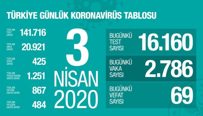 24 saatte 69 kişi hayatını kaybettiHastalığa karşı zafer elde etmenin yolu yayılmasını engellemektir. Virüsün bütün gücü yayılma fırsatıdır. Virüse bu gücü tanımayalım. Kendimizi izole edelim. Yuvamız en büyük gücümüzdür. Son 24 saatte 16 bin 160 test yapıldı. 2786 pozitif vaka daha tespit edildi. 20 bin 921 toplam vaka. 69 hastamızı kaybettik. Nüfusa göre en riskli illerimiz İstanbul, Ankara, İzmir, KonyaNüfusa göre en riskli illerimiz İstanbul, Ankara, İzmir, Konya'dır. 20 yaşından itibaren daha yoğun görüldüğü, erkellerin kadınlara göre görülme oranının daha yüksel olduğunu söylemek istiyorum. Gençlerim hastalığı ya hissetmemekte yada hafif geçirdiğini daha önce ifade etmiştim. Şuan 25 ilde can kaybımız olmadı. En yüksek can kaybımız 210 ile İstanbul. Hayatını kaybedenlerin %80'i 60 yaş üstü 60 yaş üstünün çok kritik olduğu, yoğun bakımda yatan hastaların %64'ünü oluşturuyor. Hayatını kaybedenlerin %80'i 60 yaş üstü oluşturuyor.Yoğun bakımdaki hastalarımızın %74.4'ünde en az bir alt hastalık olduğunu görüyoruz. Risk oluşturan hastalıkların başında astım hastaları geliyor. KOAH hastalarımızın 55-90 yaş arasında seyrettiğini görüyoruz. Hastaların özellikle yaş farkı göstermeden vefat edenlerin olduğunu görüyoruz.