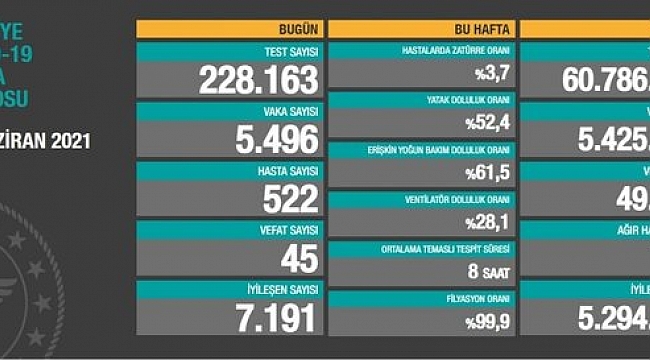 Türkiye'de son dakika corona virüsü gelişmelerini, vaka ve ölüm sayılarını her akşam paylaşan Sağlık Bakanı Dr. Fahrettin Koca, 30 Haziran Çarşamba günü vaka ve ölüm sayıları hakkında güncel bilgileri yaptığı son dakika açıklaması ile duyurdu.Bakan Koca 30 Haziran Çarşamba 45 Kişinin vefat ettiğini ve 5.496 vakaya rastlandığını açıkladı.