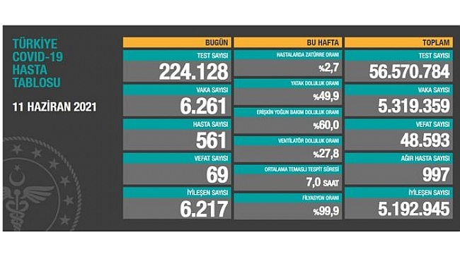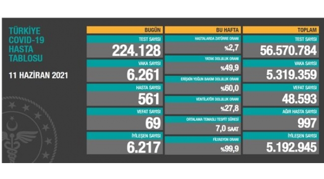 Türkiye'de son dakika corona virüsü gelişmelerini, vaka ve ölüm sayılarını her akşam paylaşan Sağlık Bakanı Dr. Fahrettin Koca, 11 Haziran 2021 günü vaka ve ölüm sayıları hakkında güncel bilgileri yaptığı son dakika açıklaması ile duyurdu.Bakan Koca 11 Haziran 2021 günü 6 bin 261 vakaya rastlandığını açıkladı.